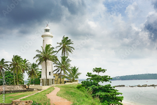 Lighthouse and palm trees on background sky