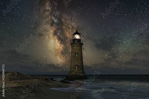 lighthouse by the ocean, with the Milky Way vividly visible in the night sky, creating a serene and beautiful atmosphere along the beach