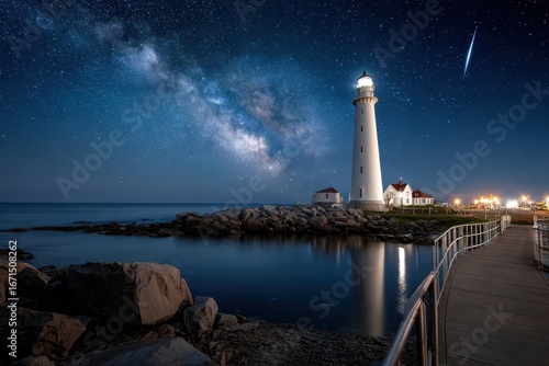 Lighthouse by the Sea Under a Starry Night Sky with the Milky Way
