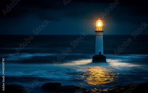 Lighthouse is lit up in the dark ocean. The light is shining on the water, creating a beautiful