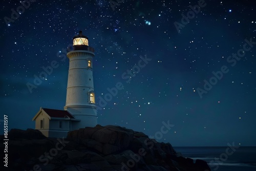 Lighthouse light guiding through the night, stars sparkling above, symbol of safety and hope, celestial calm