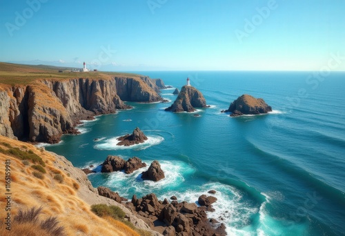 Lighthouse on rocky shore overlooking ocean