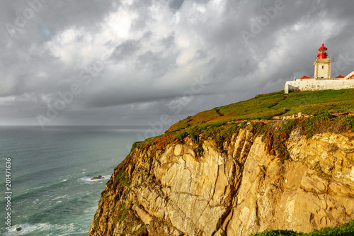 Lighthouse on top of cliff at dusk