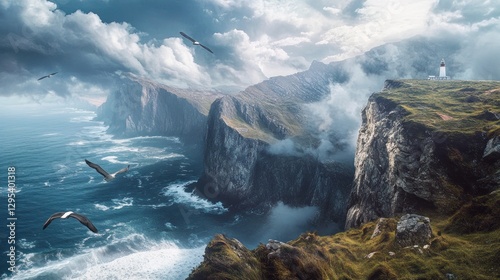 Lighthouse sits atop a scenic cliff overlooking a turbulent ocean