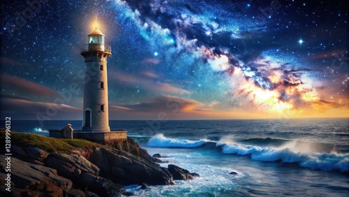 Lighthouse Standing Alone Under Starry Night Sky, waves, rugged landscape, waves, rugged landscape, light, moon, lighthouse