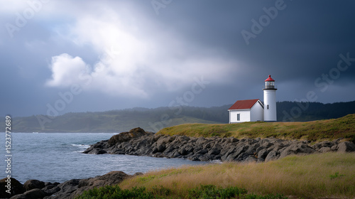 Lighthouse stands resilient against dark storm clouds near rocky coastline at dusk