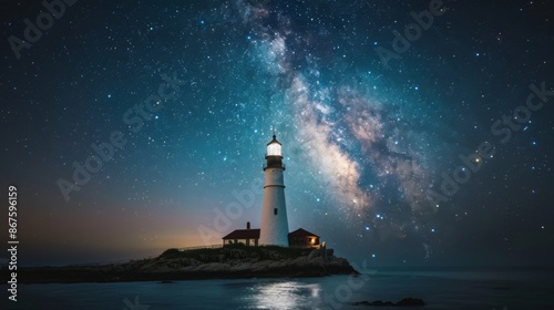 Lighthouse under a starry sky with Milky Way galaxy shining bright. Coastal night scene captures tranquility and beauty of nature.