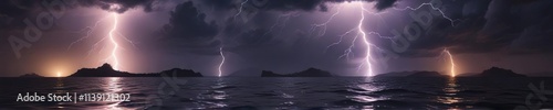 Lightning bolts illuminating the dark sky over serene waters, electrical discharges, focus, transformative power