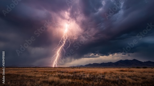 Lightning Strikes Field at Dusk with Mountain Backdrop - Environment/Energy Concept