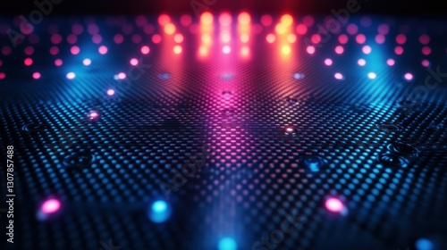 Lights glowing on reflective surface, abstract grid pattern, dark background