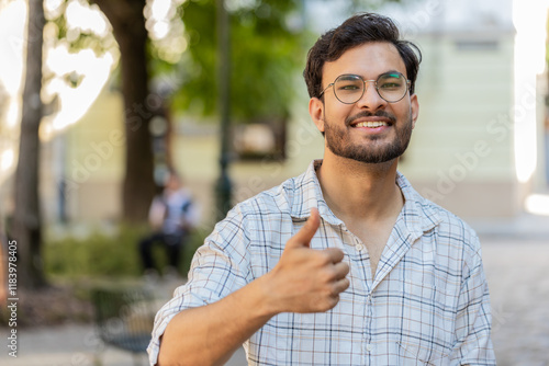 Like. Happy Indian man looking approvingly at camera showing thumbs up like sign positive something good positive feedback. Young Hispanic guy standing on urban city street. Town lifestyles outdoors.
