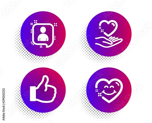 Like, Hold heart and Developers chat icons simple set. Halftone dots button. Smile face sign. Thumbs up, Care love, Manager talk. Love heart. People set. Classic flat like icon. Vector