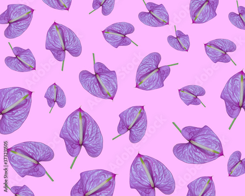 Lilac Anthurium an exotic flower on a pink background, pattern.