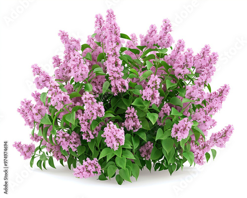 Lilac Flower Bush with Vibrant Pink Blossoms on White Background, Green Foliage, Isolated