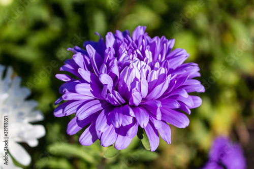 Lilac, purple aster flower close-up. Flowers grow in the garden in the open.