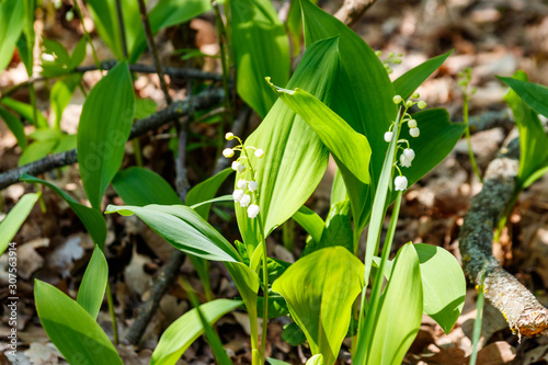 Lily of the valley (Convallaria majalis) white flowers in forest at spring