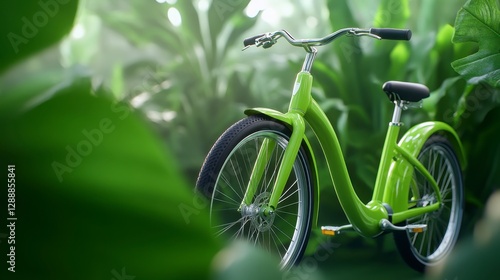 Lime green bicycle rests in lush green foliage, sunlight filters through leaves creating a soft, dreamy atmosphere. The bike's details are visible