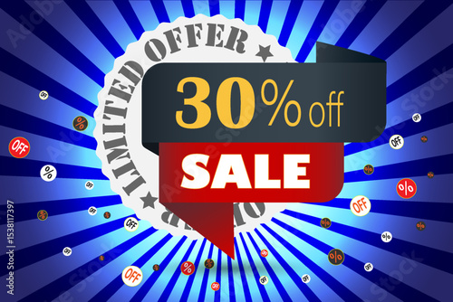 Limited offer 30 percent off sale banner with discount icons and burst background in blue and red color scheme.