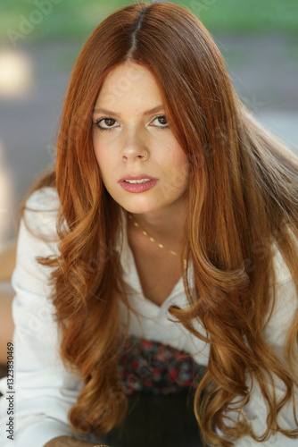 Linda modelo ruiva posando para uma sessão de fotos em um parque ao ar livre, explorando diferentes looks e capturando toda sua beleza em meio à natureza.