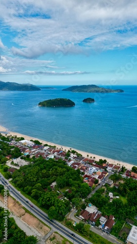 Linda vista aerea com drone sobre o mar com montanhas e cidade ao fundo com cores vibrantes.