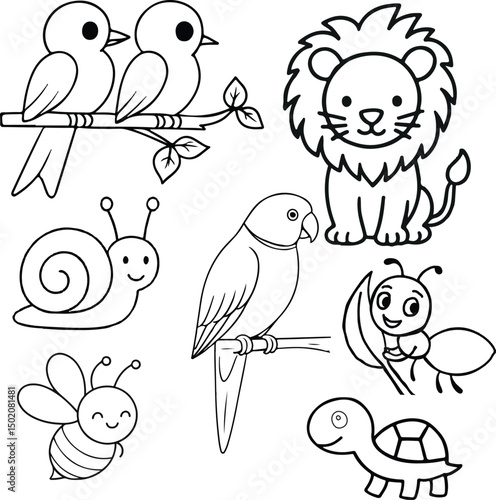 Line art Cartoon Animal Clipart Black and White Animal Coloring Page for Kids – Printable Jungle and Insect Outline Set for Kids – Jungle, Zoo, and Insect Friends