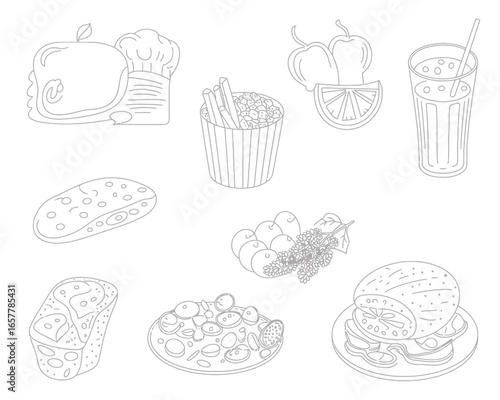 Line art collection of various food items and drinks