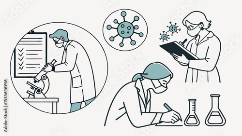 Line Art Icon Set Essential Medical Research Scientists Using Microscope Clipboard and Writing Notes with Virus Icons