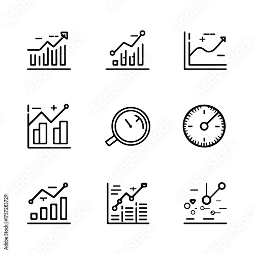 Line Art Icon Set Representing Business Growth Analytics Data Analysis and Time Management Concepts