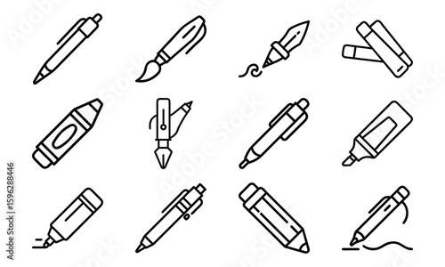 Line Art Icons of Writing and Drawing Tools Including Pens, Pencils, Markers, Paint Brushes, Fountain Pens, and Erasers for Stationery and Creative Design
