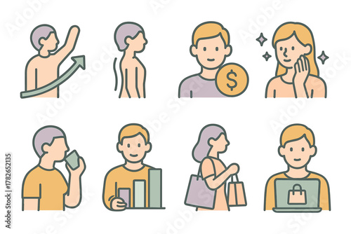 Line art icons: shopping, finance, and well-being concepts in pastel colors