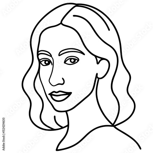 Line art illustration of a woman with wavy hair and neutral expression