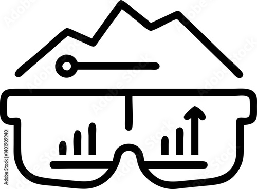 line art illustration of augmented reality glasses features mountain landscape and data graphs, symbolizing technology and innovation. design is simple and modern