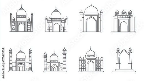 Line art illustration set featuring iconic historical landmarks including a mausoleum fort memorial tomb minaret palace and archway