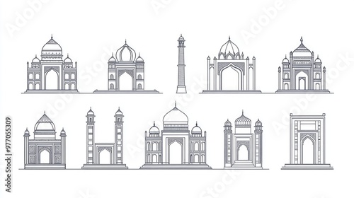 Line art illustration set featuring iconic historical landmarks including a mausoleum fort memorial tomb minaret palace and archway