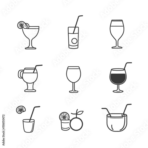 Line Art Illustrations Of Different Drinks With Straws