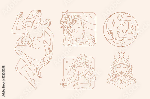 Line art magical esoteric female naked body and portrait decorated by half moon and blossom flower