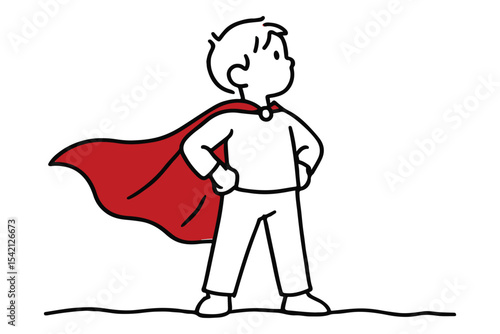 line art of a child with superhero cape, posing confidently, minimalistic design