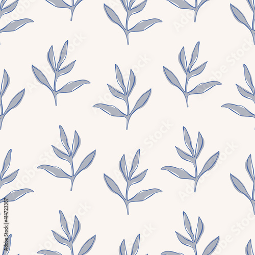 Line art seamless pattern with peony leaves and branches. Floral background in pastel color. Vector botanical pattern for wrapping paper, female prints and fabric. Colorful flat vector illustration