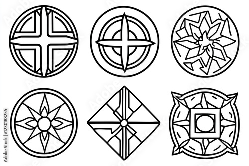 Line art vector illustration of religious symbols for a coloring book, with a simple and clean layout. The six traditional borders, such as a star, cross, moon,