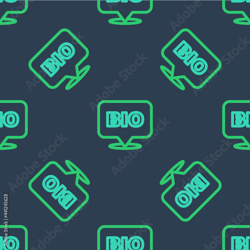 Line Bio green healthy food icon isolated seamless pattern on blue background. Organic product. Healthy food sticker. Vector