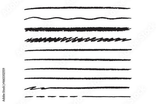Line crayon pencil underline color set. Hand drawn colorful brush, chalk and marker stroke in sketchy kid art style. Rough crayon pencil texture highlight divider element. Vector illustration