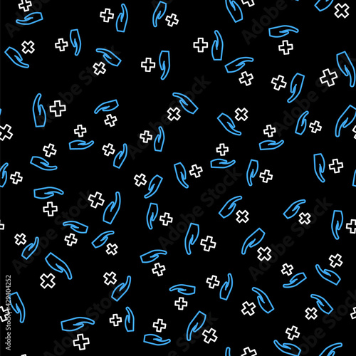 Line Cross hospital medical icon isolated seamless pattern on black background. First aid. Diagnostics symbol. Medicine and pharmacy sign. Vector