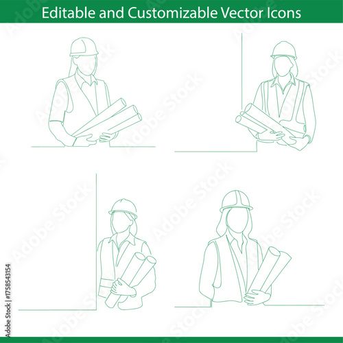 Line drawing of a construction worker holding blueprints and continuous line drawing art style