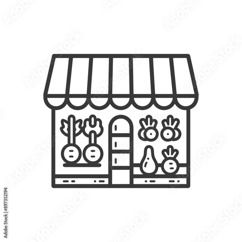 Line drawing of a small storefront with vegetables for sale
