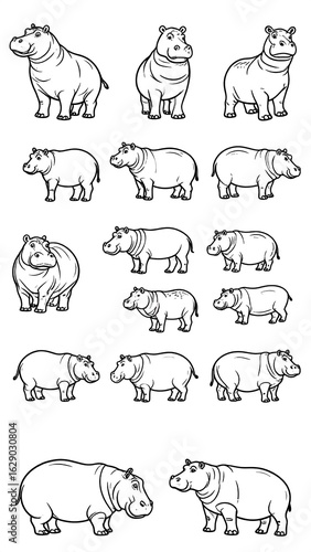 Line drawings of hippos in various sizes and poses