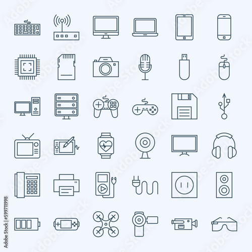 Line Gadgets and Devices Icons Set. Vector Set of Modern Thin Outline Technology and Electronic Items.