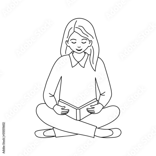 Line Girl reading book sitting. Outline young woman with book in hands isolated on white background. Vector illustration for coloring page
