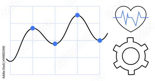 Line graph with data points next to heart rate symbol and gear icon. Ideal for data analysis, health monitoring, technology, statistics, research, innovation, simple landing page