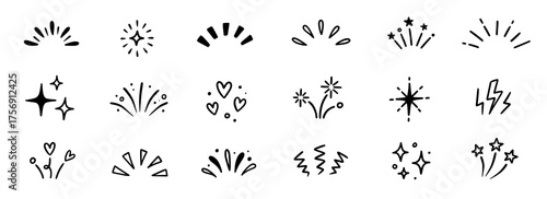 Line icon ray, confetti element set. Starburst line art with hand drawn glitter spark, pop icon shapes and surprise emphasis elements. Decorative sketch style for a sunshine ray vector illustration