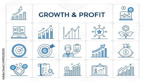 line icons for financial growth, ROI, and company success